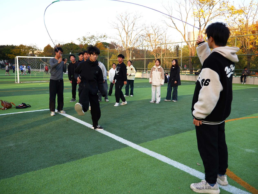 跳大绳时,摇绳的同学节奏稳定,跳绳的同学依次衔接,即便出现失误也迅速调整状态,重新加入,默契的配合赢得场边阵阵掌声。
