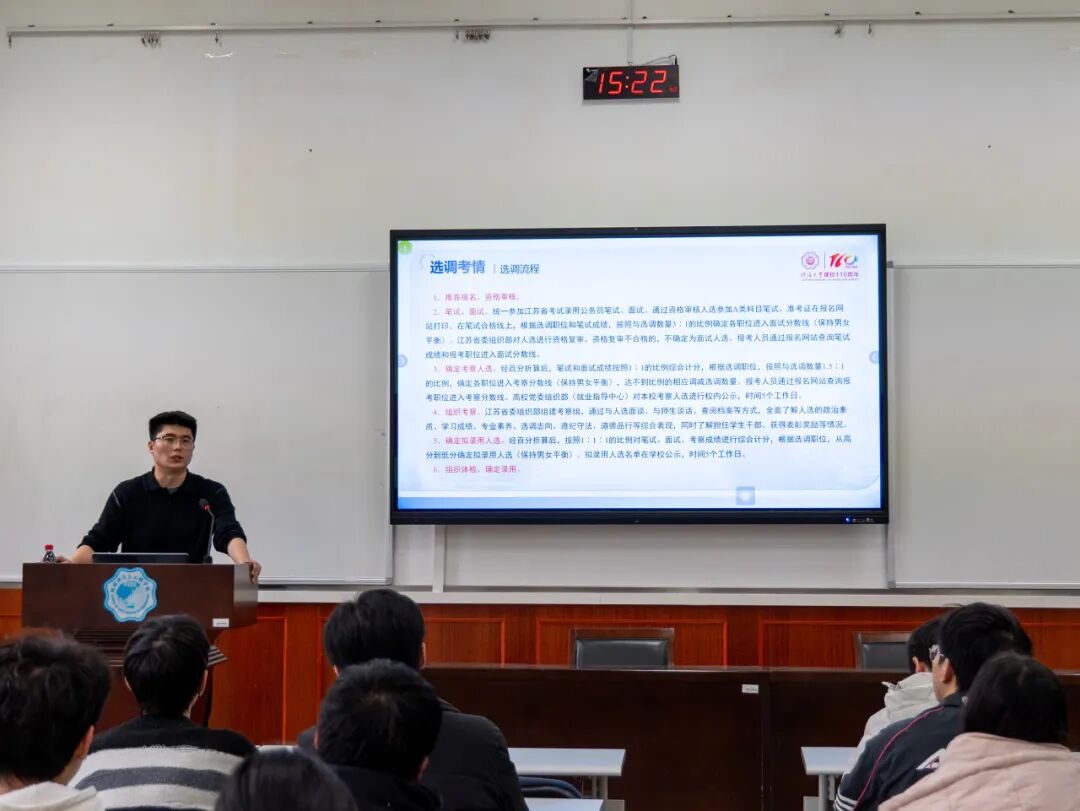 首先,吴沐原老师系统梳理了国考与省考的考情异同、招录趋势及完整报考流程。随后,他聚焦于选调生这一渠道,结合我校定位与名额优势,深入解读政策。最后,讲座扎实落脚于实战层面,从行测各模块的提分技巧、申论材料的剖析,到面试的表达逻辑与临场心态,进行了细致拆解和分析。