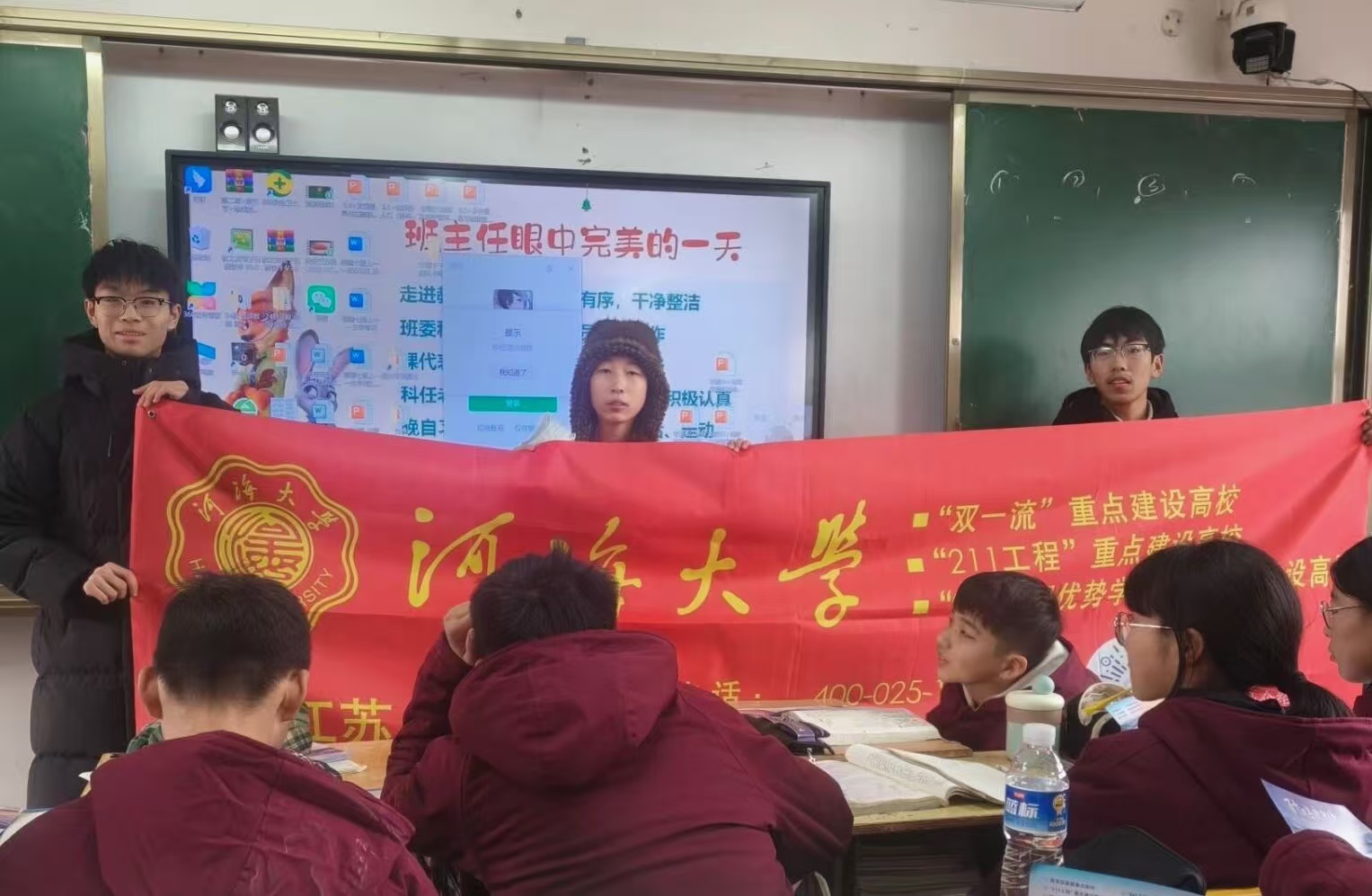 饮水思源念故土,河海学子踏归程。为回馈母校兰考一高的悉心栽培,传递河海大学百年文脉与精神内核,帮助学弟学妹明晰成长方向,刘朝、李嘉澎、杨昊天三位同学组成实践团队,以“河声海韵迎君来”为主题开展寒假社会实践活动,通过宣讲分享、互动交流、回访恩师等形式,完成了一场意义非凡的感恩之旅与梦想接力。