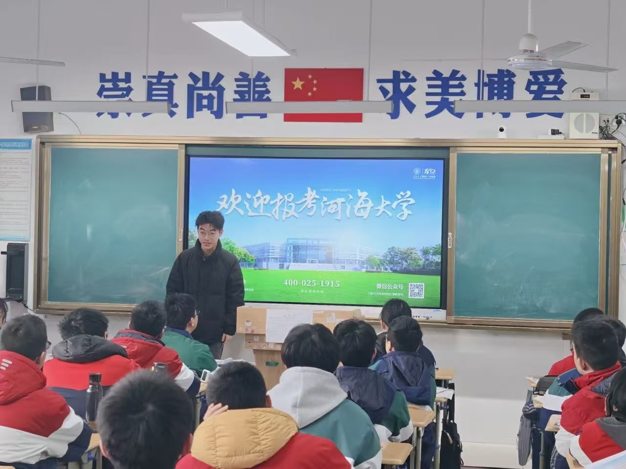 宣讲伊始,小队成员播放河海大学招生视频,生动展现学校的深厚底蕴、水文化特色以及水利工程等领域的顶尖实力,瞬间点燃同学们的兴趣。随后,五位成员依次分享自己的专业认知、发展前景与就业趋势,吕钰琦同学结合自身认知实习经历,用真实案例解读专业优势,极具说服力。此外,大家还毫无保留地分享高中学习经验与备考心得,为学弟学妹们加油鼓劲。宣讲结束后,同学们围绕专业选择、校园生活、就业方向等问题踊跃提问,成员们耐心细致解答,还通过精心设计的互动环节与周边物料发放,让大家加深对河海“以水为兴”的理念认知,现场氛围温馨融洽.
