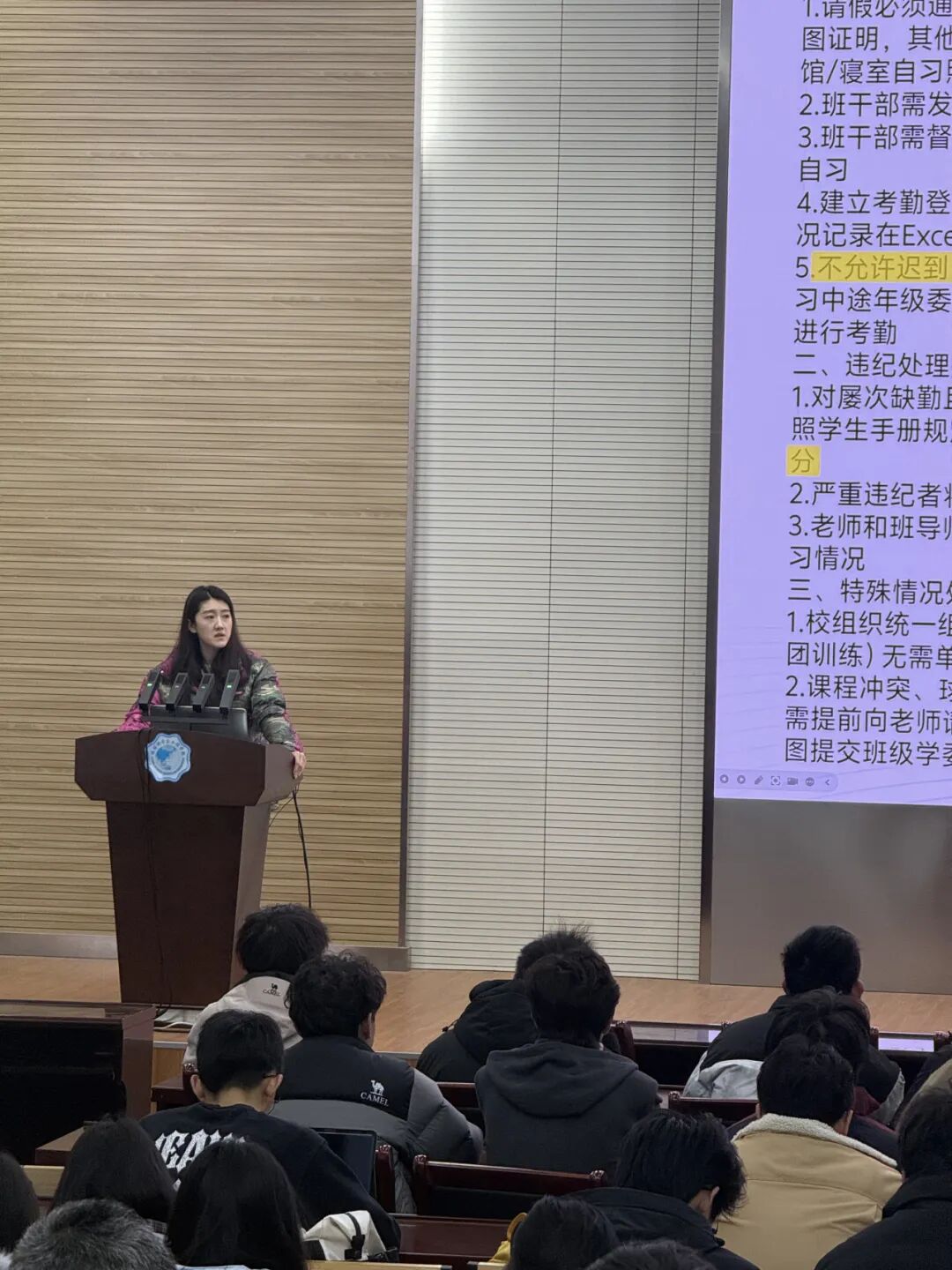 在纪律管理方面,会议着重强调了“两早一晚”纪律要求。闫老师详细解读了“两早一晚”的具体规范与考核标准,重申了纪律要求对大学生日常学习生活的重要性,要求同学们严格遵守,培养自律自强的良好作风。此外,会议还对“闪动校园校园跑”活动进行了安排说明,鼓励同学们积极参与,在运动中增强体质,展现青春活力。