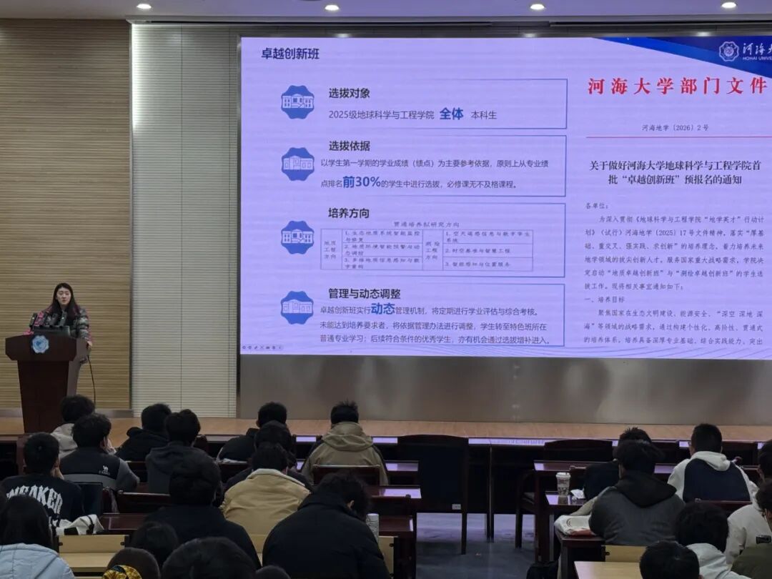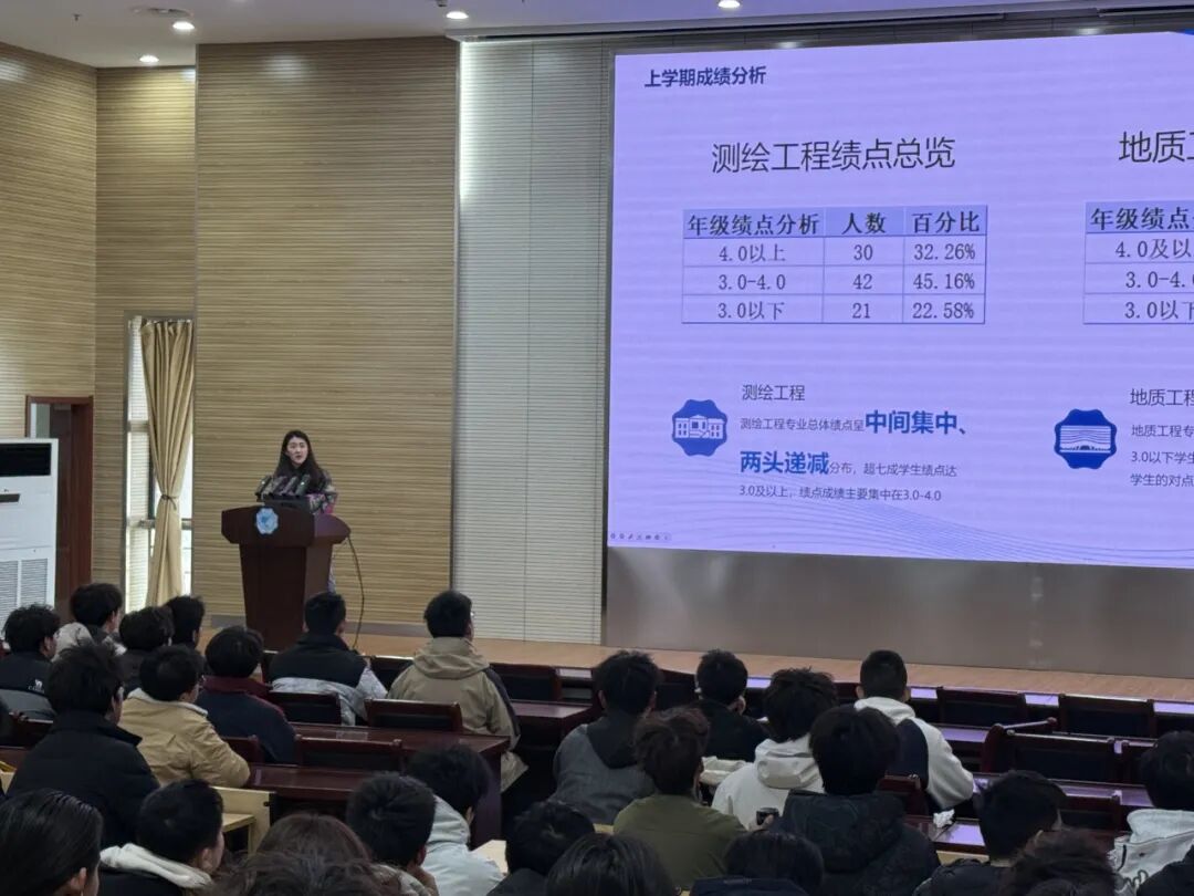 为全面总结大一上学期学业成果,明确后续发展规划,强化学生纪律意识与综合素质培养,2026年3月4日下午14:30,地球科学与工程学院2025级本科生年级大会于笃学楼208教室顺利召开。本次会议由学院2025级本科生辅导员闫蕴琦主持,2025级全体本科生参会。