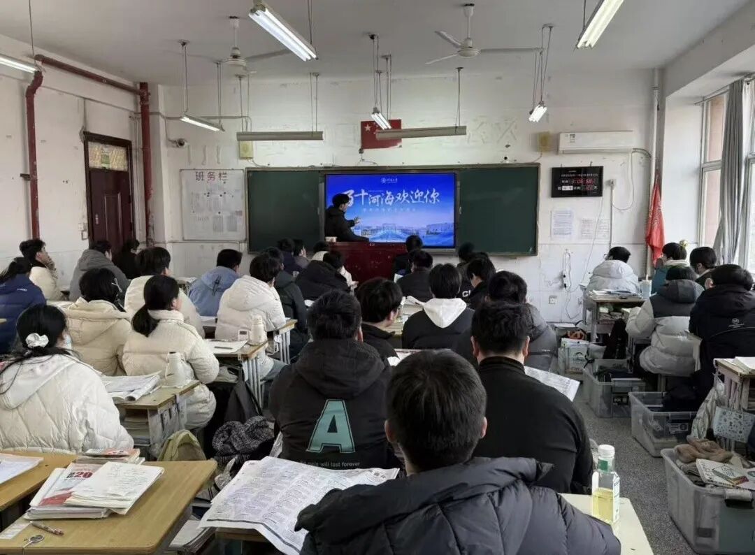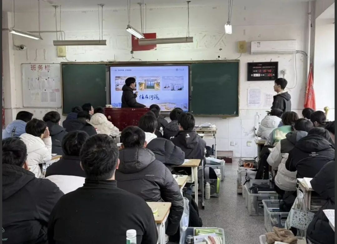 一月三十一号,宣讲活动正式拉开帷幕。宣讲现场,团队首先播放河海大学2026年招生宣传视频,用震撼的画面、生动的讲解,全方位展现河海大学的百年底蕴与办学实力,瞬间点燃现场学子的热情。随后,团队成员依托精心打磨的PPT,以“过来人”的视角,结合自身从宿城一中到河海大学的求学经历,从百年校史、学科优势、专业设置、校园生活、升学就业等多个维度,全面解读河海大学的独特魅力。