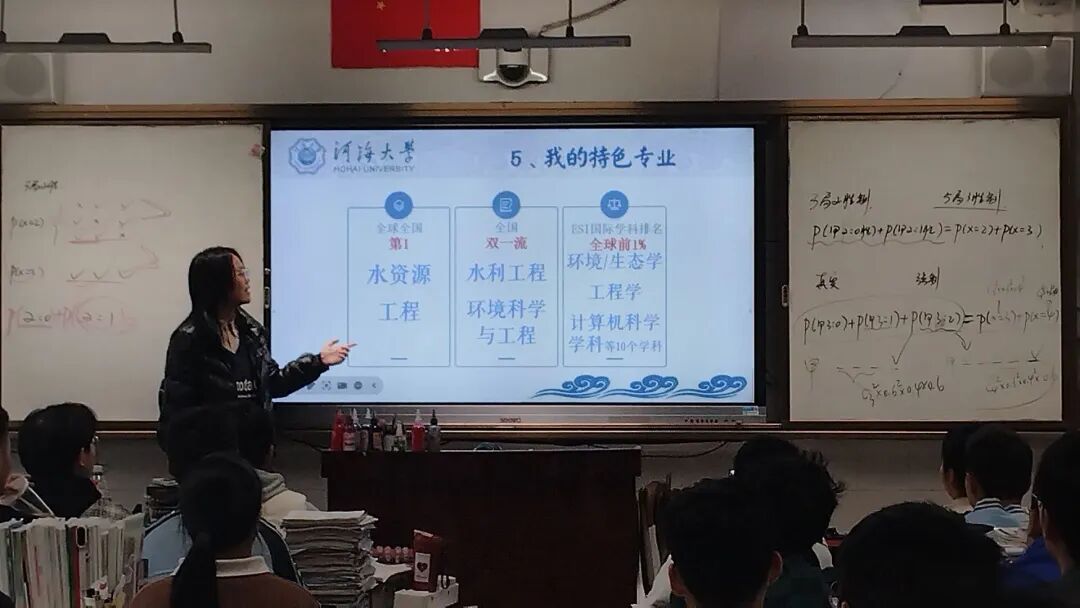 通过播放宣传片、讲解PPT,宣讲员不仅介绍了河海大学作为“水利高层次创新创业人才培养的摇篮”的硬实力,更分享了从二中到河海的心路历程、时间管理方法与参与科研竞赛、社团活动的精彩故事。
